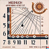 ![]() Sonnenuhr (Mi Wagener 1985) - Schlossturm Mersch - Sonnenauer - Schlass Miersch (Photos: 20.10.2011 jmo) Mersch 49°46 nord - 6°06 est TEMPUS FUGIT - FRUERE HORA (Die Zeit entflieht - genieße jede Stunde) MIDI VRAI A MERSCH |