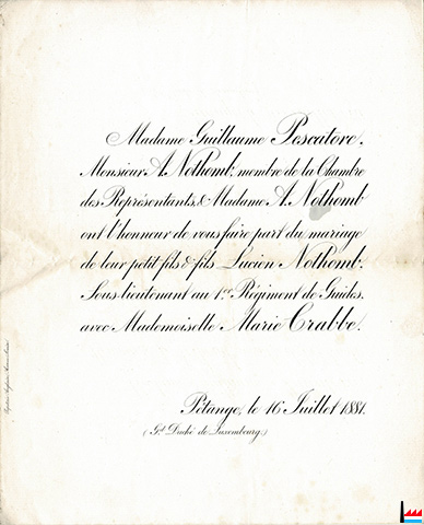 | 1881 | ![]() Mariage de Lucien Nothomb, sous-lieutenant au 1er Régiment de guides - Marie Crabbe (Collection: industrie.lu) Pétange, le 16.7.1881 Wilhelmique Pescatore M. et Mme Alphonse Nothomb |