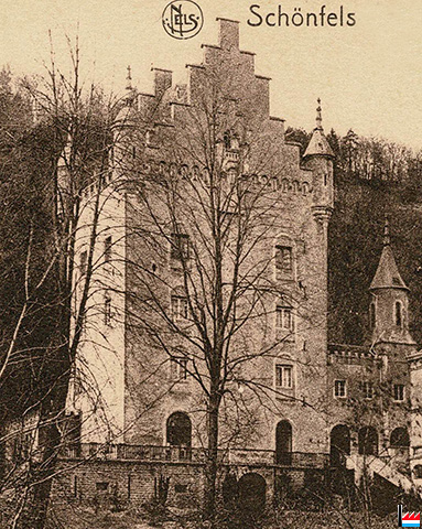 | 1933 | Das im schönen Merschertal gelegene Schloss Schönfels mit geräumigen Dependenzien, schönen Gärten und Park, circa 7 Hektar in einem Bering, ist zu verkaufen Besichtigung jederzeit, nach Anfrage bei Notar Eichhorn in Mersch. (t: 2.6.1933) |