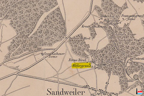 Ferme Grevelscheuer - Birelerbarrière - Ferme Birel - Birlergrund - Birelerbach - Kreuz von Mousel - Höhenhof - Ferme Franzosengrund - Langen Weyer - Stackelges Weyer - Stackeltgesgraecht - Birelbach - Sandweiler - Unterste Neuhaeusgen - Oberst Neuhaeusgen - Neumühle - Bohmuhl |