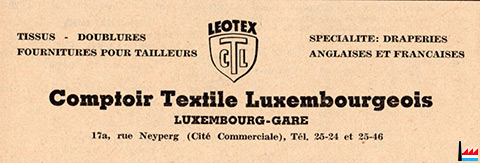 | <=1948/49 | Comptoir Textile Luxembourgeois - LEOTEX Léopold Levy 17a rue Neyperg, Luxembourg Tél: 25-24 et 25-46 |