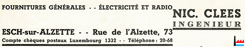 | 1929 | Etablissements N. Clees, ingénieur, Esch/Alzette, 2 rue Bolivar, tél: 58 Radio Ducretet, Wellenempfang von 10 - 3000 m (t: 27.4.1929) |