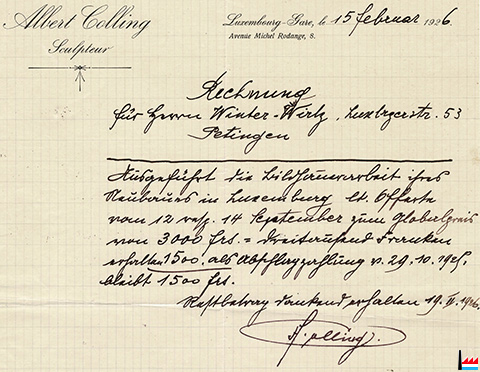 Colling Albert, sculpteur, Luxembourg, 8 avenue Michel Rodange - facture du 15.2.1926 pour Winter-Wirtz, Pétange (Collection: industrie.lu)