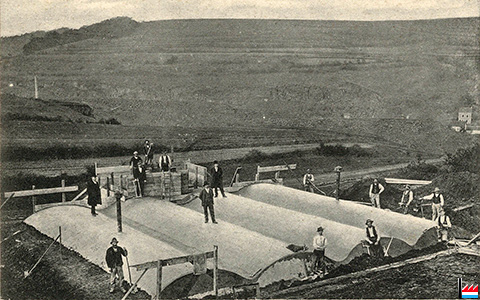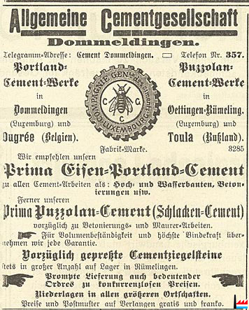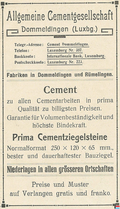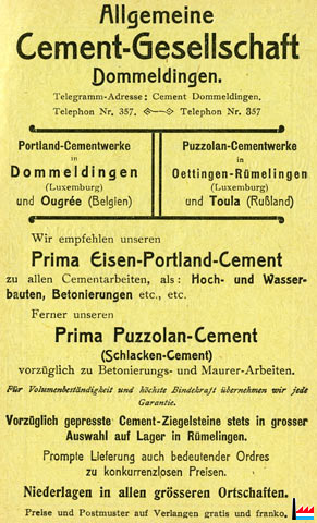 | <=1908 | La cimenterie de Dommeldange fait partie du syndicat «Süddeutsche Zement-Verkaufsstelle». Le ciment qu'elle fabrique s'emploie pour tous les travaux indistinctement. Il est introduit par les grandes administrations allemandes. | ||