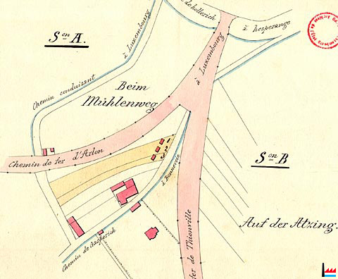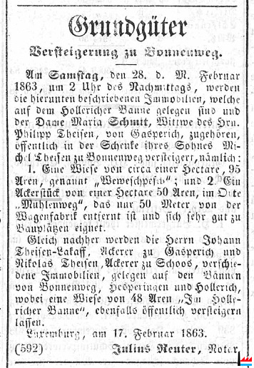 Bei der Versteigerung eines Hauses am 10.6.1877 heisst es "Wohnhaus, gelegen zu Gasperich im Mühlenweg zwischen Lakaff und der Strasse, stossend an die Hospizien und an Moyen. Dieses Haus, sehr vortheilhaft in der Nähe der Kutschenfabrik gelegen, begreift 9 Zimmer, Keller, Backstube, Cisterne usw." (LW: 1.6.1877). |