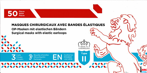 Surgical Face Masks with elastic Earlops - Type II - Made in Luxembourg - Masques chirurgicaux avec bandes élastiques - Conforme EN14683 + AC: 2019 - Santé Services S.A., Luxembourg, 9 rue Edward Steichen - www.medlogistics.lu