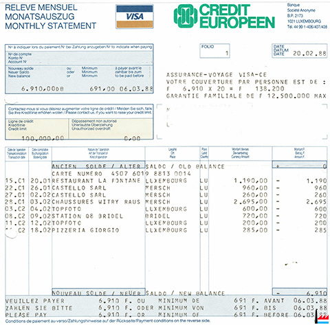 VISA - Relevé mensuel - Monatsauszug - Monthly statement - Crédit Européen . 2.1988 (Collection: industrie.lu)