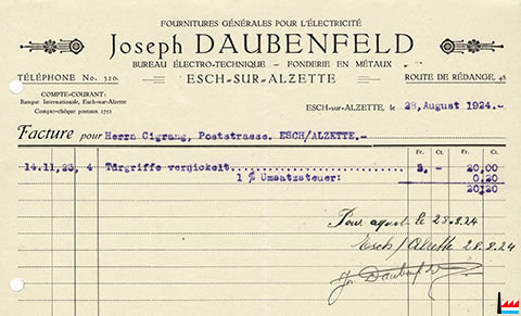 ![]() Daubenfeld Joseph, Esch/Alzette, 48 route de Rédange, tél: 320 - Facture du 28.8.1924 (Collection: industrie.lu) Fournitures générales pour l'électricité Bureau électro-technique - Fonderie en métaux |