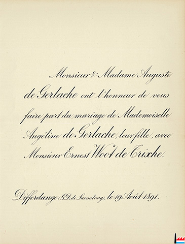 | 1891 | ![]() Mariage Angéline de Gerlache - Ernest Woot de Trixhe |