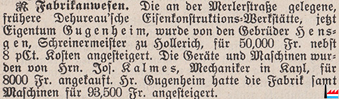 | 5.1907 | Das Fabrikanwesen, frühere Dehureau'sche Eisenkonstruktions-Werkstätte, jetzt Eigentum Gugenheim, wurde von den Gebrüder Hensgen, Schreinermeister zu Hollerich, für 50.000 fr, nebst 8% Kosten angesteigert. Die Geräte und Maschinen wurden von Jos. Kalmes, Mechaniker in Kayl, für 8.000 fr angekauft. (BBZ: 18.5.1907) |