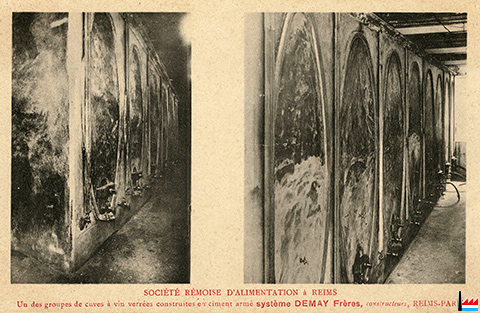 à Reims - Un des groupes de cuves à vin verrées construites en ciment armé système Demay Frères, constructeurs, Reims-Paris (Carte