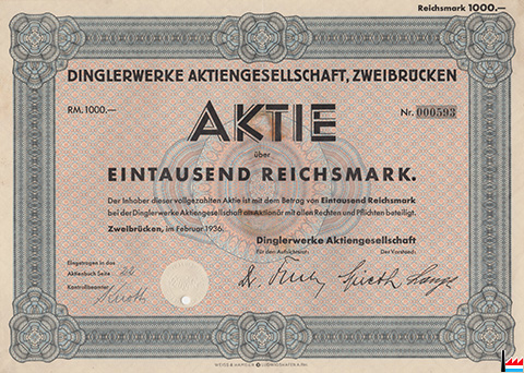 Dinglerwerke A.G. Zweibrücken - Aktie über 1000 RM (Collection: industrie.lu)