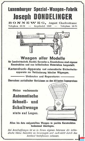 | 1936 | Joseph Dondelinger Luxemburgische Spezial-Waagenfabrik August Karlstrasse, Bonneweg, rue Auguste Charles Tél: 3071 |