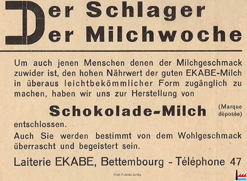 Der Schlager der Milchwoche: Schokolade-Milch (Marque déposéee) - Laiterie EKABE, Bettembourg - Téléphone 47