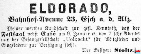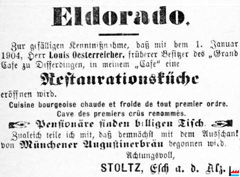 | 1904 - 1905 | Café-Restaurant Eldorado (Esch/Alzette, Eck Poststraße ?) Inhaber: Stoltz Michel |