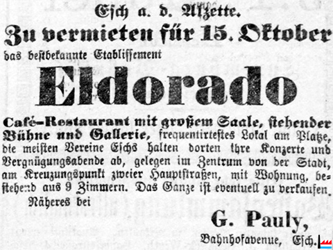 | 15.10.1908 | ![]() Eldorado zu vermieten / zu verkaufen. G. Pauly, Bahnhofavenue, Esch/Alzette(Arme Teufel: 6.9.1908) |