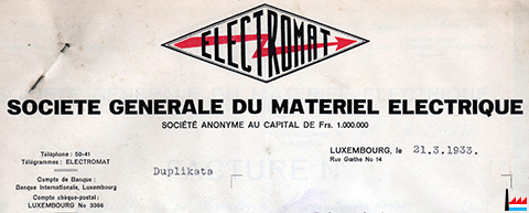 | 1929 | Fondation - Gründung: Electromat S.A. - Société générale du matériel électrique durch SOLPEE, Société financière luxembourgeoise pour le commerce et l'industrie, Philippstraße Kapital: 1 Million Fr |