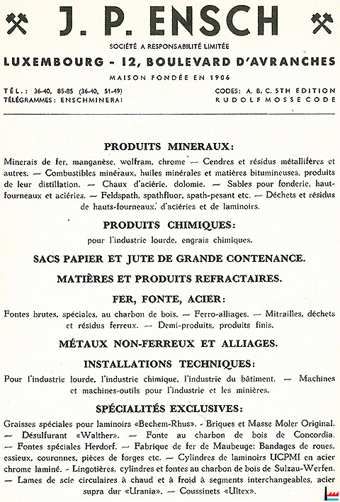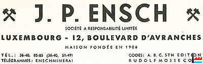 | <=1942 | Jean-Pierre Ensch, Industrielle Rohstoffe Moselstraße 12, Luxemburg Tél: 3640 |