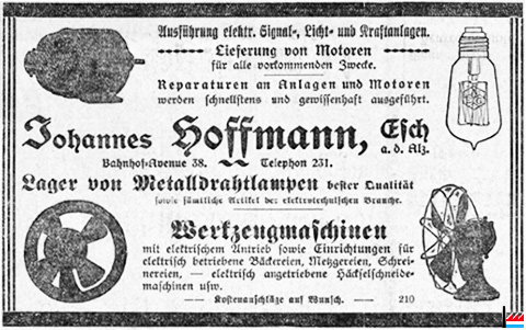| <=1913 | ![]() Johannes Hoffmann, Esch/Alzette, 38 avenue de la Gare, tél: 231 Ausführung elektr. Signalanlagen, Lichtanlagen, Kraftanlagen Metalldrahtlampen (t: 6.10.1913) |