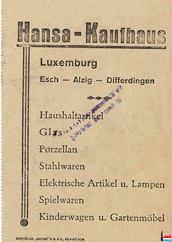 | <=1941 | ![]() Hansa Kaufhaus, Esch/Alzette (Carte postale: Jos. Pohlen, Lichtdruck-Verlag, Düren-Birkesdorf; collection: industrie.lu) |
