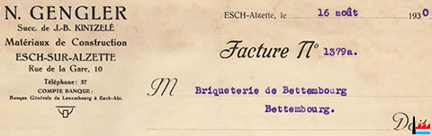 | 10 | ![]() N. Gengler, succ. de J.-B. Kintzelé - 1930 (Collection: industrie.lu) Matériaux de Construction 10 rue de la Gare, Esch/Alzette |