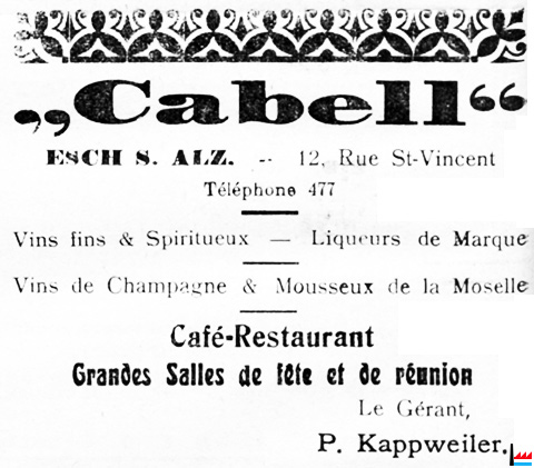 | <=1923 - 1928 | ![]() Café-Restaurant Cabell, Esch/Alzette, gérant: Kappweiler P., Esch/Alzette, Vincentstraße 12 (Arme Teufel: 19.5.1923) Grandes salles de fête et de réunion Tél: 477 |