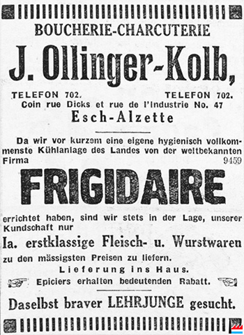 | 8.1929 | ![]() Boucherie-Charcuterie J. Ollinger - Kolb, coin rue Dicks et 47 rue de I'Industrie, Esch/Alzette, tél: 47 (t: 16.8.1929) Frigidaire Kühlanlage |