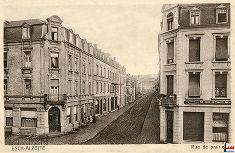 ![]() Esch/Alzette, rue de la Prairie = rue des Prés (= 1947: rue du 10 Septembre) - <=1920 (Carte postale: Maison de gros P. Houstraas, Luxembourg; Collection: industrie.lu) |
