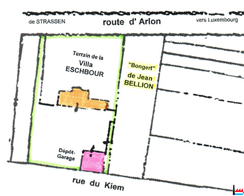 Kadasterplang 1945 - Villa Eschbour, Dépôt - Garage (Stopp vun Zwangsrekrutéierten: Raymond Ries, Merl; Nicolas Koehner, Rümlingen; Pierre Diederich, Strassen; Metty Diederich, Strassen) (Collection: Pierre Diederich)