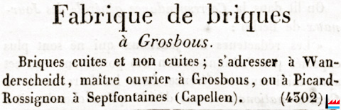 | 1850 | Fabrique de briques, Grosbous Briques cuites et non cuites ; s'adresser à Wanderscheidt, maître ouvrier à Grosbous, ou à Picard - Rossignon à Septfontaines (Capellen) (CDGL: 29.6.1850) |