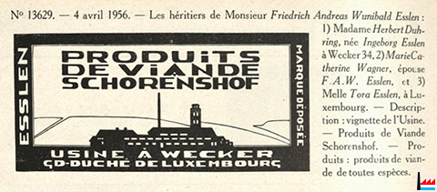 | 1959 | Produits de Viande Schorenshof, Usine à Wecker Mme Esslen ép. Duhring |