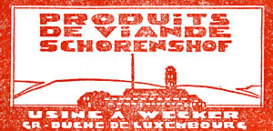 | 1.1939 | Fleischwarenfabrik Schorenshof, Wecker Alle Produkte tragen eine Plombe mit der Aufschrift „Schorenshof", die für gute Qualität des Rohmaterials und sauberste Verarbeitung garantiert. Einige Spezialitäten von Schorenshof, die alle die nationale Schutzmarke "Luxembourg" tragen: Luxemburger Zossis, italienische Salami, Rollschinken, Nußschinken, Lachsschinken, Nackenstück (Judd, Kasseler, Rippenspeer, usw.), |