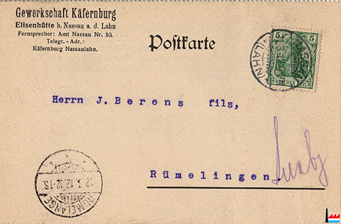 | 3.1912 | ![]() Postkarte von der Gewerkschaft Käfernburg, Elisenhütte bei Nassau an der Lahn an J. Berens fils, Rümelingen: Anlieferung gelbe Minette - 1912 (Carte postale collection: industrie.lu) |