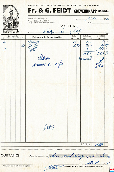 Distillerie Fr. et G. Feidt, Grevenknapp (Mersch) - facture du 18.8.1956 (Collection: industrie.lu)