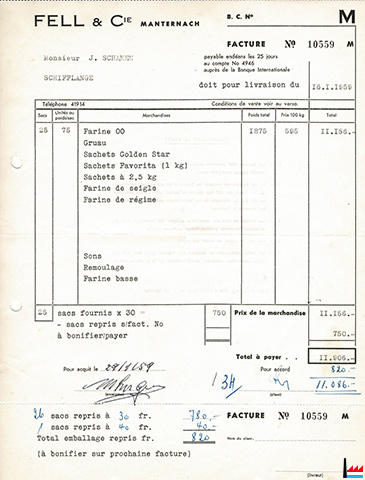 | <=1.1959 | ![]() Fell & Cie, Manternach - Facture à Boulangerie J. Schanen, Schifflange, 5 rue Klapp (Collection: Michèle Schanen) Farine 00 Gruau Sachets Golden Star Sachets Favorita |