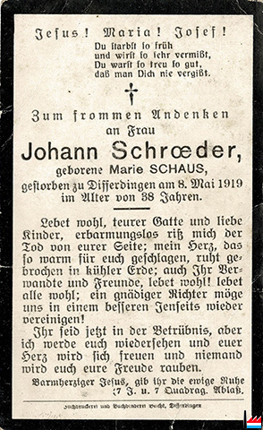 | 8.5.1919 | ![]() Décès de Marie Schaus, 1ère épouse de Jean Schroeder (Pächter in Kahler), à Differdange, Koloniestrasse (elo rue Dicks-Lentz) 35 (Collection industrie.lu) |