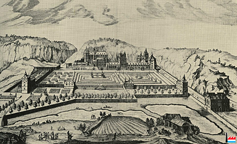 Ancienne maison Fischer se trouve sur le site du château du Comte de Mansfeld, Clausen (Extrait d'une peinture de Joan Blaeu Amsterdam - 1648)