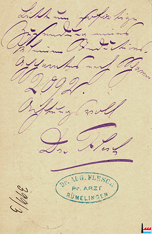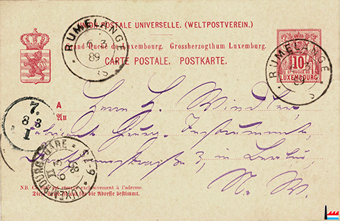 | 1889 | ![]() Dr Aug. Flesch, Pr. Arzt, Rümelingen - 1889 (Carte postale: collection: industrie.lu) |