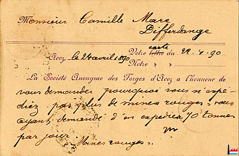 | 4.1890 | Camille Marc, agent d' Acoz à Differdange Les Forges d'Acoz demandent de recevoir 70 tonnes de mines rouges par jour (Carte à Camille Marc, agent d'Acoz à Differdange - Acoz, le 24.4.1890; Collection: industrie.lu) |