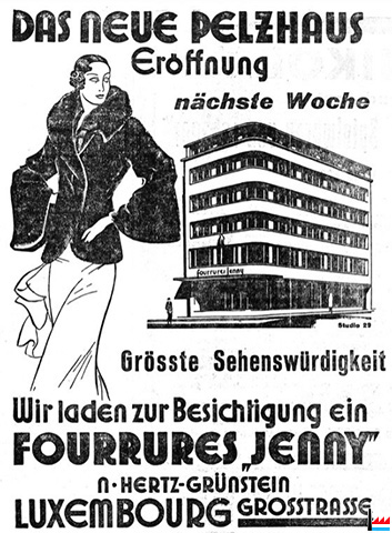 | 12.1932 | Im Neubau Hertz-Grünstein, beste Lage Großstraße, per bald zu vermieten: Auskunft im Hause selbst, Fourrures Jenny, Luxemburg (LW: 29.12.1932) |