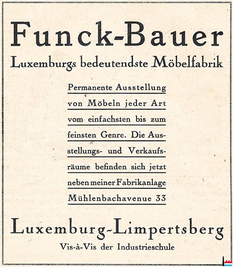 1924 - Funck-Bauer - Luxemburgs bedeutenste Möbelfabrik - Luxemburg-Limpertsberg - Vis-à-Vis der Industrieschule - Dans: Letzebuerger Fuesendskalenner vum GUKUK, 1924, Buchdrëckerei Linden & Hansen, 128 S. (Collection Philippe Aschman)