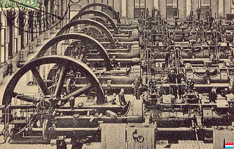 Erster 600 pferdiger Gichtgasmotor erbaut durch die Firma Cockerill für das Differdinger Werk. (Das Bild zeigt den Motor auf der Versuchsbank in Seraing.)
