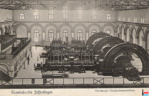 Hütte Differdingen - Gasmaschinenzentrale - Gasgebläsezentrale (Carte postale: Verlag Ch. Grieser, Hofphotograph, Luxemburg, 1916; collection: industrie.lu)