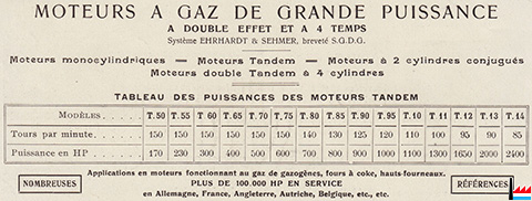 | 1937 | Lieferung der Großgasmaschine Nr. 11, der bis dahin größten Gasmaschine der Welt, an die Differdinger Hütte. Die doppelt wirkende Zwillings-Tandemmaschine von Ehrhardt & Sehmer wiegt 1150 t und leistet 11.000 PS. Sie war bis 1979 in Betrieb und ist erhalten geblieben. |