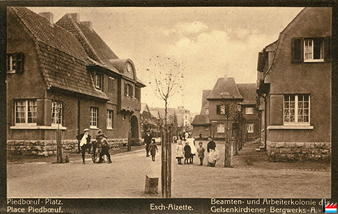 Esch/Alzette - Piedboeuf-Platz - Place Piedboeuf (= rue Léon Weirich, rue de l'Usine, Auf der Acht) - Beamten- und Arbeiterkolonie der Gelsenkirchener Bergwerks A.G. in Esch/Alzette / Luxemburg (Postkarte: Papeterie Kremer - Muller, Esch-Alz.; Collection: industrie.lu)
