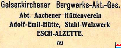 | <=1917 | ![]() Gelsenkirchener Bergwerks-A.G. Abteilung Aachener Hüttenverein Adolf-Emil-Hütte, Stahl-Walzwerk Esch/Alzette - 3.3.1917 (Postkarte Collection: Marcel Schlim) |
