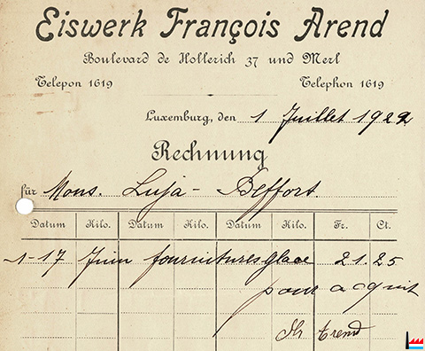 | <=1922 | ![]() Eiswerk François Arend, Luxemburg, 37 Boulevard de Hollerich und Merl, tél: 1619 - facture du 1.7.1922 à Luja-Beffort, Luxembourg (Collection: industrie.lu) |