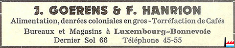 | <=1948/49 | Denrées coloniales en gros Goerens J. et Hanrion F., 64-66 Dernier Sol, Luxembourg | ||