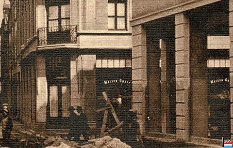 | 1916 | ... Etwas früher warf ein Betrunkener ein großes Schaufenster des Modehauses Graff Soeurs (Ecke Poststraße) ein. Er wurde in Haft genommen. (LW: 28.2.1916) |