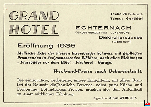 | 5.1935 | Ouverture: Grand Hôtel Wengler, Echternach Albert Wengler - Mailliet (avant: Hôtel du Commerce - Hôtel Kons, Luxembourg-gare) |